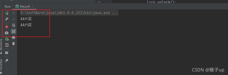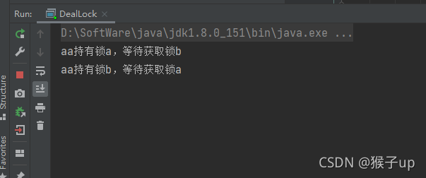 结果如下:出现死锁状态,原因:上面的所没有释放,下面的线程无法获取不到锁。  ? ? -