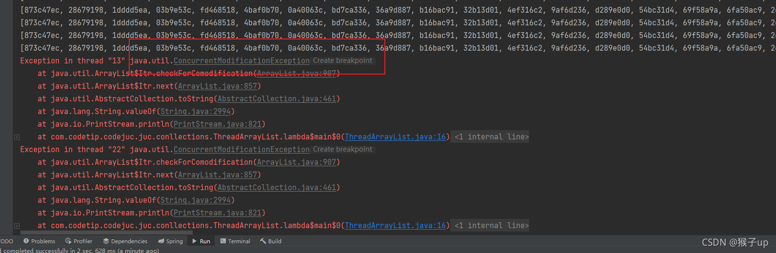 System.out.println(list); // 产生集合不安全的地方,取的时候,有线程还在放入内容,出现了并发修改问题