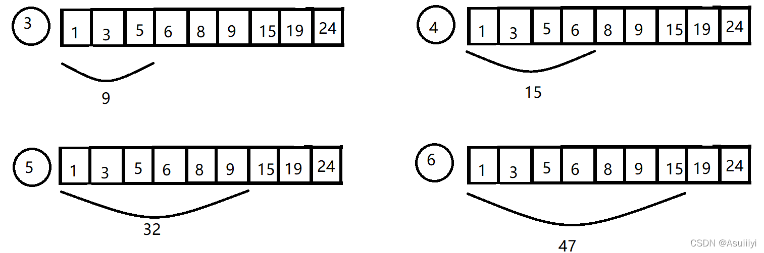 我们往后增加子序列元素,此时子序列为{1、3},总和为4,远远不到34,我们继续。