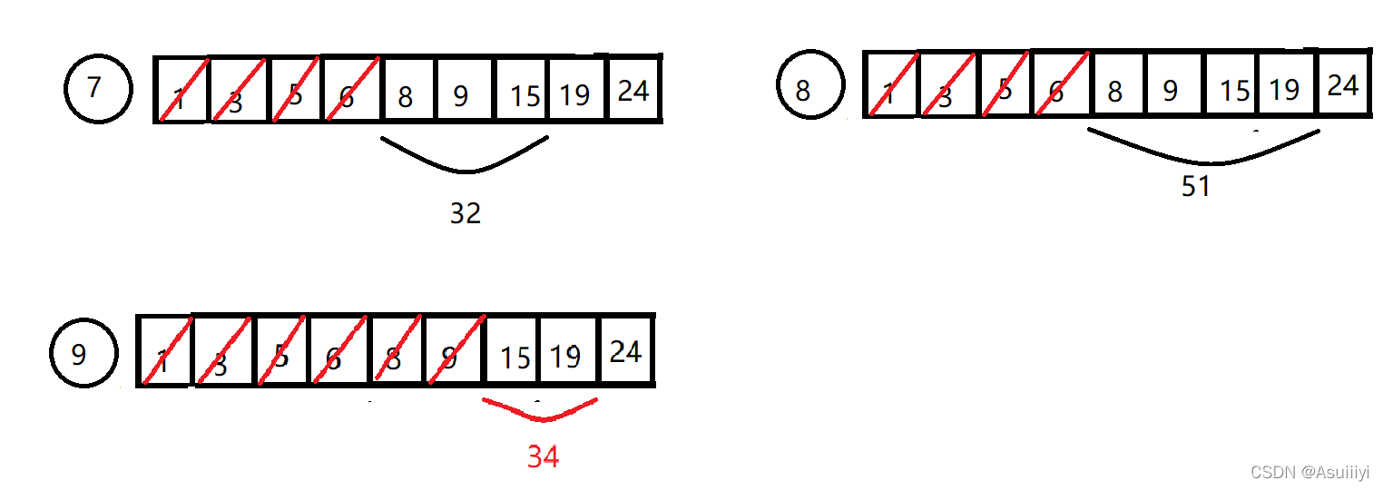 ?直到第五步,所选连续序列中已经有了“1”,“3”,“5”,“6”,“8”,“9”,总和为32,很接近M的大小,我们继续。