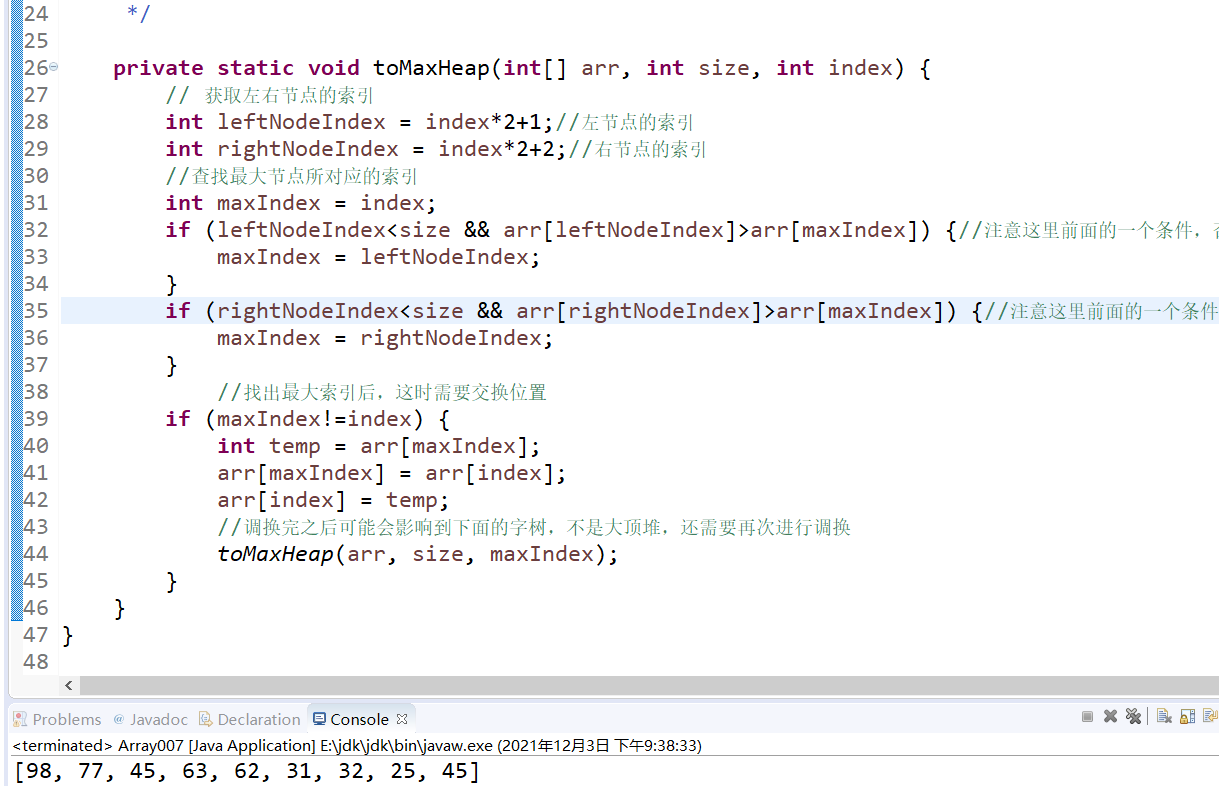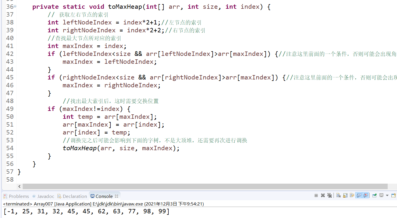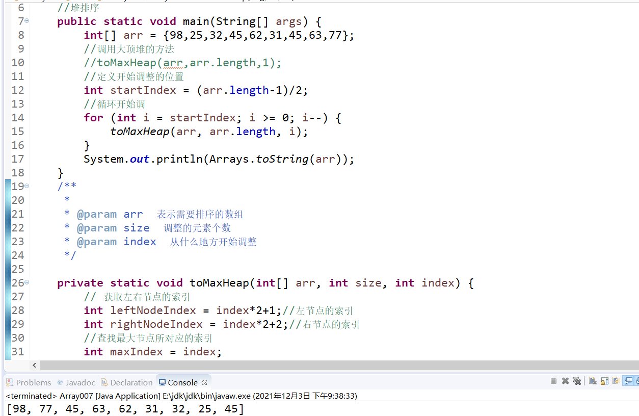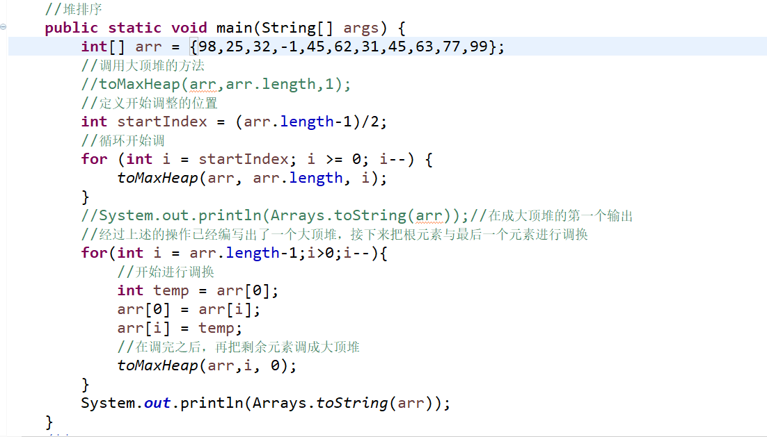 在堆排序中,大顶堆排序是将最值也就是大顶堆最上面的第一个值,每一次将该值取出,最后得到一个有序的数组。 第一个大顶堆,代码图示:   代码展示+注释(第一个大顶堆):