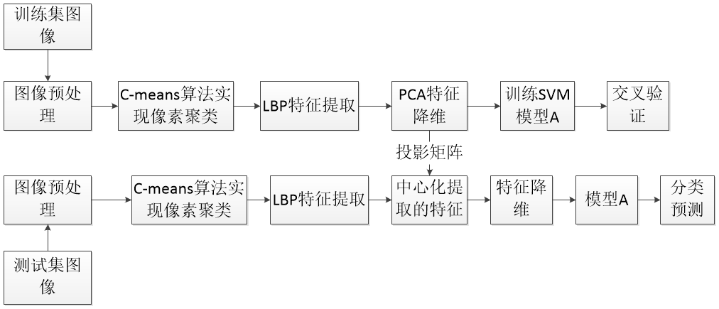 ????????在经过上述图像预处理、图像像素聚类、LBP特征提取、PCA特征降维至两维过程之后,将二维特征向量作为输入训练SVM模型,最终得到模型在训练集上的分类准确度。
