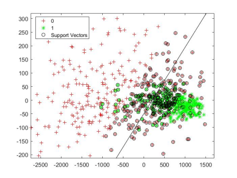 ????????5)利用对训练集降维后得到的二维特征训练SVM二分类模型,