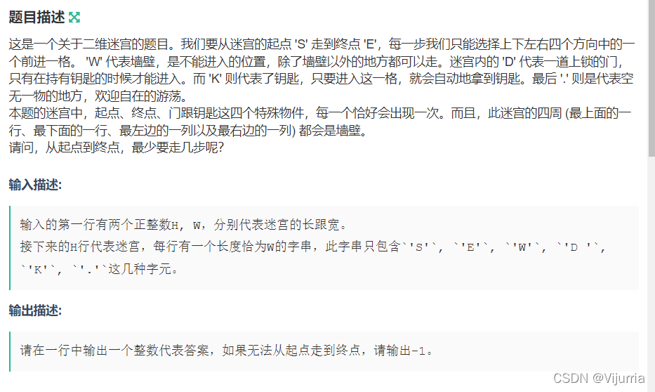 if(x>=2&&x<=n-1&&y>=2&&y<=m-1&&d[x][y]==-1&&a[x][y]!='W'&&a[x][y]!='D')//去拿钥匙的路上还是不能走锁门了的地方