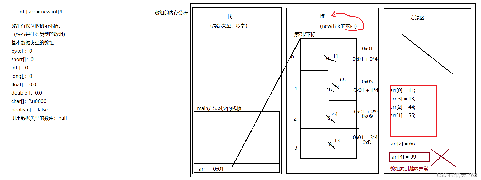 ps:数组变量属于引用类型,数组也是对象,数组中的每个元素相当于该对象的成员变量。数组本身就是对象,java中对象是在堆中的,因此数据无论保存原始类型还是其他对象类型,数据对象本身是在堆中存储的。