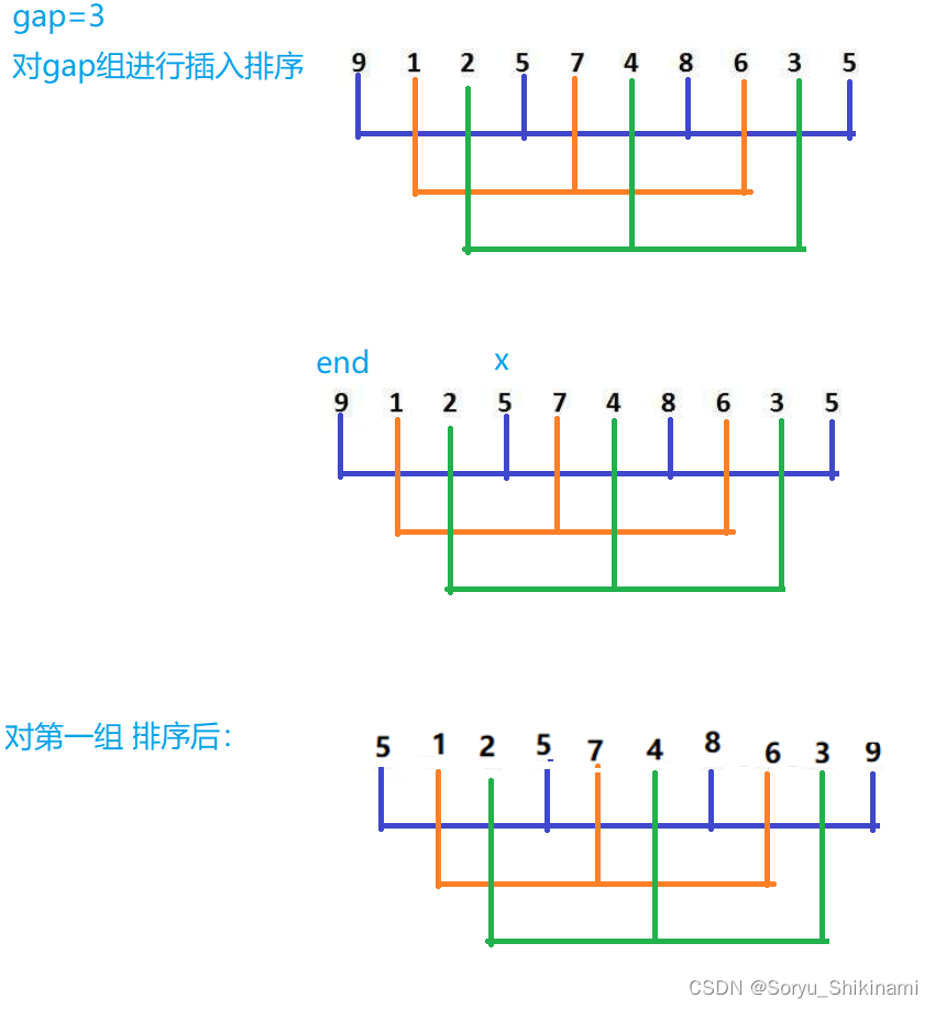 假设 gap = 3,按照gap分组,对每一组进行插入排序。