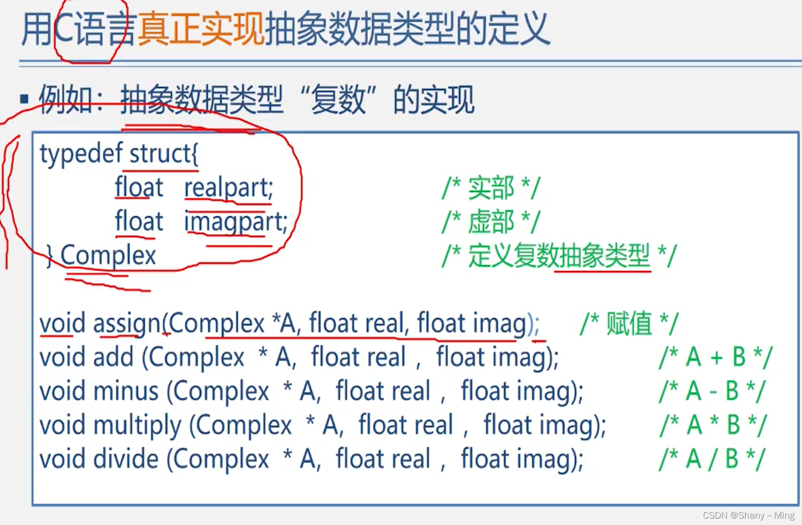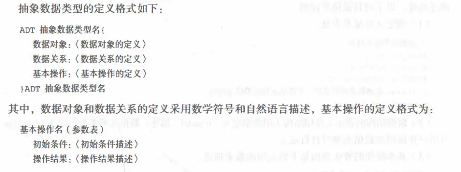 抽象数据类型(Abstract Data Type, ADT)一般指由用户定义的、表示应用问题的数学模型,以及定义在这个模型上的一组操作的总称,具体包括三部分:数据对象、数据对象上关系的集合以及对数据对象的基本操作的集合。
