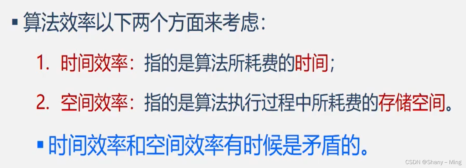 (4)高效性。高效性包括时间和空间两个方面。时间高效是指算法设计合理,执行效率高,可以用时间复杂度来度量;空间高效是指算法占用存储容量合理,可以用空间复杂度来度量。时间复杂度和空间复杂度是衡量算法的两个主要指标