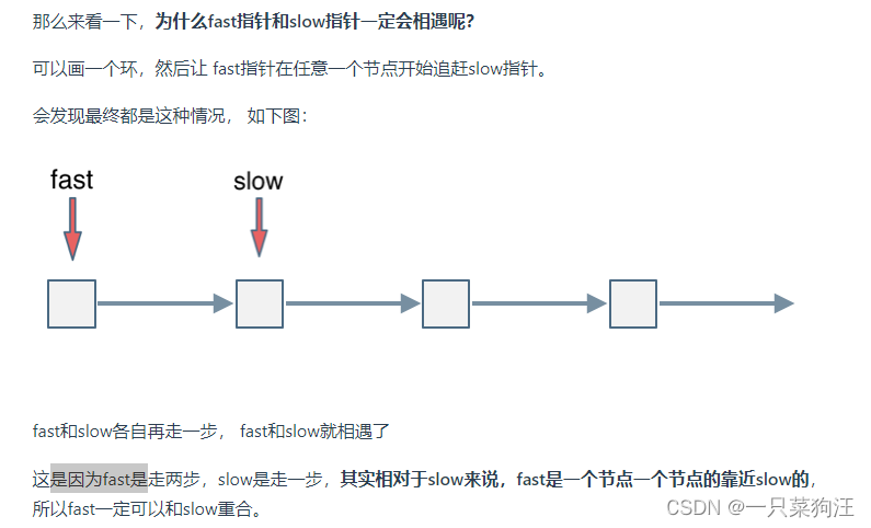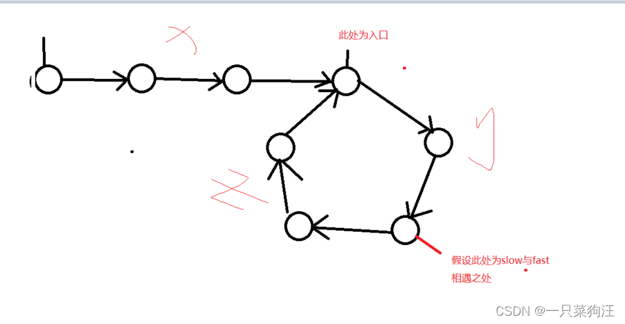 ? 由此知:假设node1节点从头开始,node2节点从相遇位置开始,node1与node2同时一步一步走,那么相遇之处即为入环之处