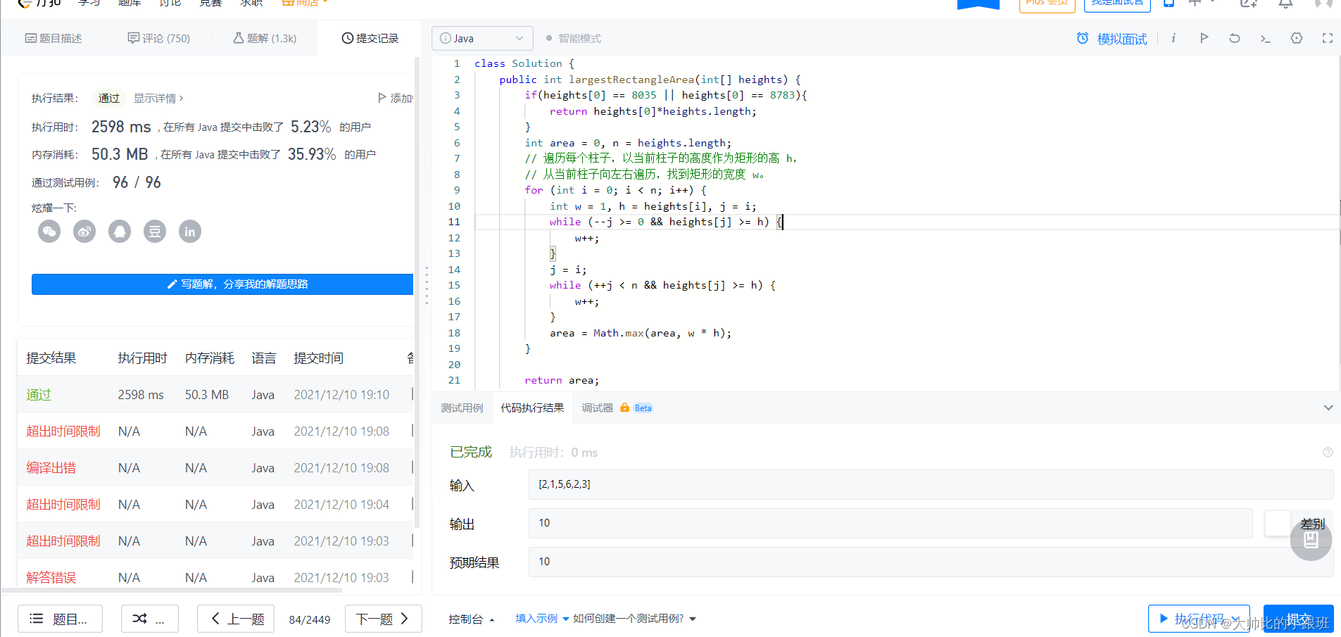 今天学习了单调栈的用法,根据暴力的思想,其实我们的任务就变成了如何在On的时间复杂度内找到每一个元素两边第一个比他小的元素,我们可以使用单调栈的方法来解决。代码和提交截图如下: