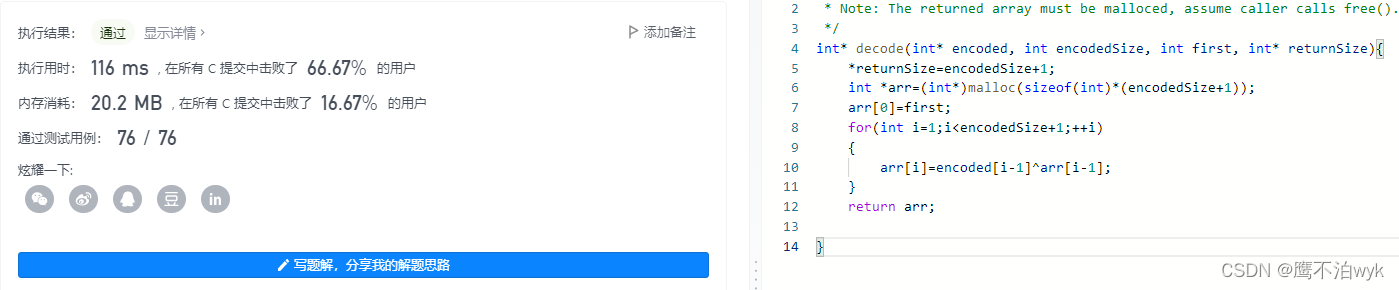 思路:对于异或来说,若a^b=c,那么就有a^c=b、b^c=a(在解题时找出的规律,后面会解释)所以除arr[0]为first外,arr[i]=arr[i-1]^encoded[i-1]