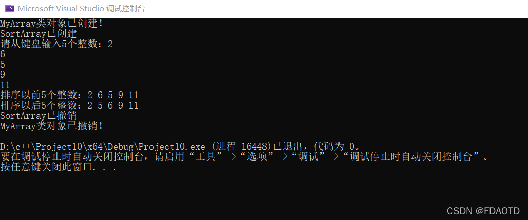 心得: 本次实验学习了派生类的声明方法和派生类构造函数的定义方法,并通过编写程序来验证实验目的,编写了MyArray类的一个子类SortArray来实现对输入数据的排序。实验中运用了冒泡排序法来进行实验,实现了数据排序功能。