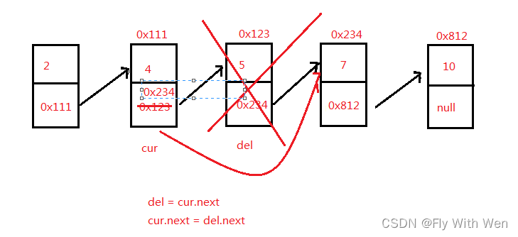 cur.next = del.next;//将删除的节点的 左右两边的 节点 连接,从而删除的节点没有连接就被去掉了