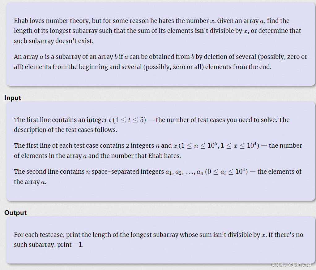 #include<bits/stdc++.h> using namespace std; int t , n , x , a , mini = 1e9, maxi = 0 , sum ; int main() { ?? ?cin >> t ; ?? ?while(t--) ?? ?{ ?? ??? ?maxi = 0 ; ?? ??? ?mini = 1e9; ?? ??? ?sum = 0 ; ?? ??? ?cin >> n >> x ; ?? ??? ?for(int i = 1 ; i <= n ; i ++ ) ?? ??? ?{ ?? ??? ??? ?cin >> a ; ?? ??? ??? ?sum += a ; ?? ??? ??? ?if(a%x!=0) //判断是否可以整除x ?? ??? ??? ?{ ?? ??? ??? ??? ?mini = min(i,mini);//左 ?? ??? ??? ??? ?maxi = max(i,maxi);//右 ?? ??? ??? ?}? ?? ? ? ? ? } ?? ??? ?if(sum%x!=0) cout << n << endl; ?? ??? ?else if(sum%x==0&&(mini<1||maxi>n)) cout << -1 << endl; ?? ??? ?else cout << max(n-mini,maxi-1) << endl;? ?? ?} ?? ?return 0; }