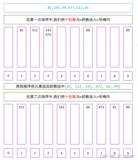 //既然是基于桶排序,我们先创建一个二维数组bucket[10(桶数)][arr.lenth(桶的容量)]