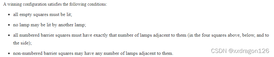 # 2. 同一行或列最多是有一个灯,即已经被点亮的地方,不能再放置灯