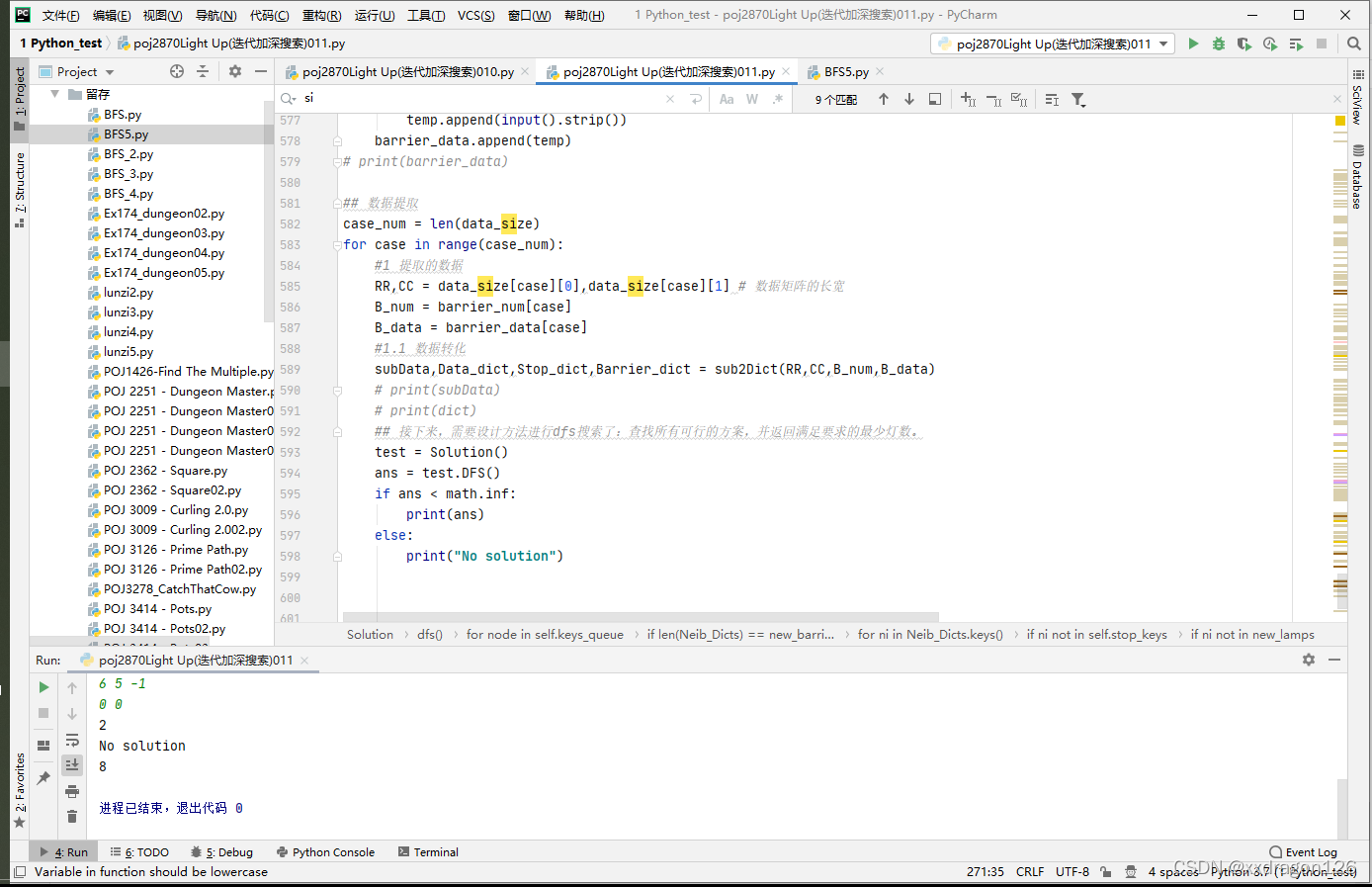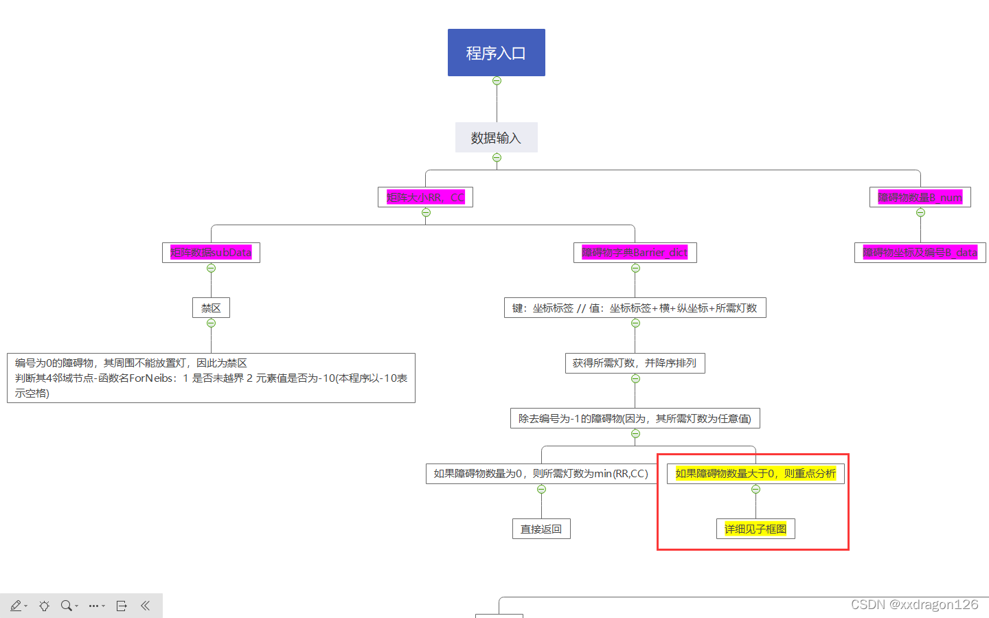 ????????点灯位置赋值为-30。 ## 1 编号为0的障碍物的4邻域为禁区,不能放置灯; ## 2 以编号最大的障碍物的邻接点为初始顶点,进行DFS搜索; ## 3 对当前障碍物的邻点放置灯时,该灯周围如果有其他障碍物,也将被照亮; ## 4 本题分为2级DFS:第一级,为障碍物点灯,寻找所有可行的方案;第二级,对各个可行方案中的空白点灯 ## 4.1 在确定障碍物的点灯方案后,当对空白网格进行点灯时,灯的周围不能有障碍物,否则将使得障碍物的点灯方案有误。 ## 4.1.1 如果为空白网格点灯时,其周围存在障碍物,则将该位置赋值为-100;再继续对其他空白进行点灯,直到无-10存在。最后,判断是否有-100,无-100说明点灯成功。 # # 5. 终止条件 # # 第一级dfs:所有障碍物的所需点灯均已安装完毕 # # 第二级dfs:? 所有空白格均已点灯完毕 # # 6?本程序需要查询所有方案,不能使用return True or False,而是使用 return。