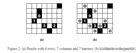 ?????????给定一个矩阵如图(a)所示,其中黑色方框表示障碍物,障碍物的编号表示其周围需要的灯的数量(无编号的障碍物所需的灯数不限);除此之外,空白网格所在行列也需要有灯存在,以便于照亮该空白网格。