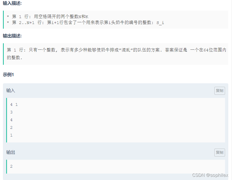 链接:登录—专业IT笔试面试备考平台_牛客网 混乱的奶牛 [Don Piele, 2007] Farmer John的N(4 <= N <= 16)头奶牛中的每一头都有一个唯一的编号S_i (1 <= S_i <= 25,000). 奶牛为她们的编号感到骄傲, 所以每一头奶牛都把她的编号刻在一个金牌上, 并且把金牌挂在她们宽大的脖子上. 奶牛们对在挤奶的时候被排成一支”混乱”的队伍非常反感. 如果一个队伍里任意两头相邻的奶牛的编号相差超过K (1 <= K <= 3400), 它就被称为是混乱的. 比如说,当N = 6, K = 1时, 1, 3, 5, 2, 6, 4 就是一支”混乱”的队伍, 但是 1, 3, 6, 5, 2, 4 不是(因为5和6只相差1). 那么, 有多少种能够使奶牛排成”混乱”的队伍的方案呢?
