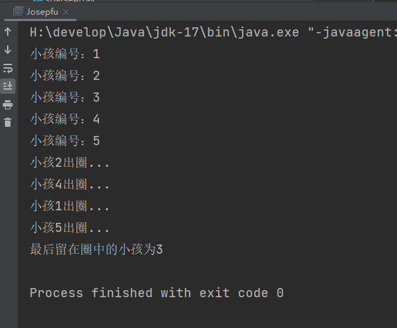 System.out.printf("小孩%d出圈...\n",first.getNo());