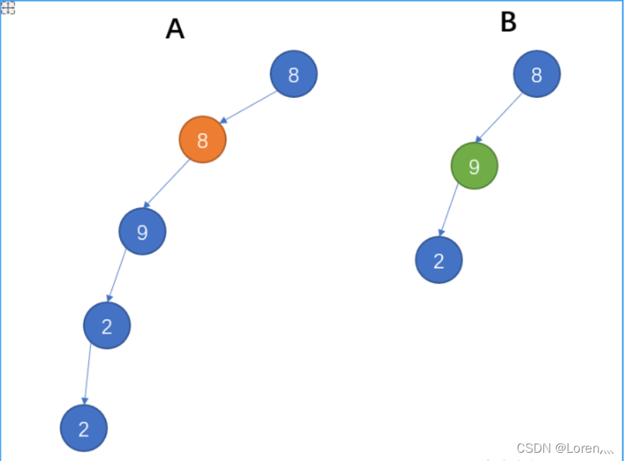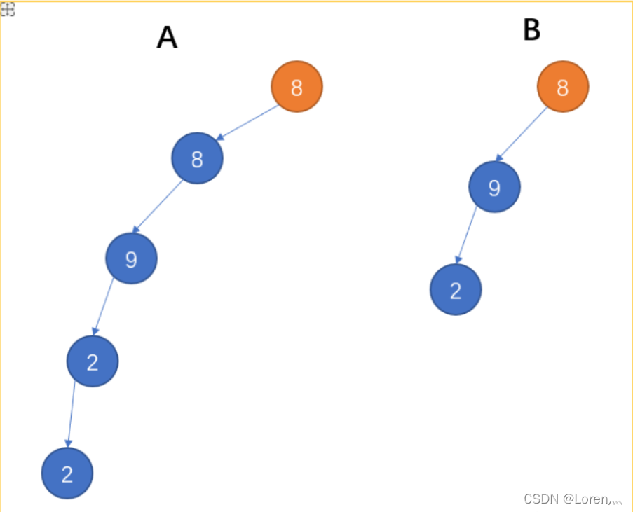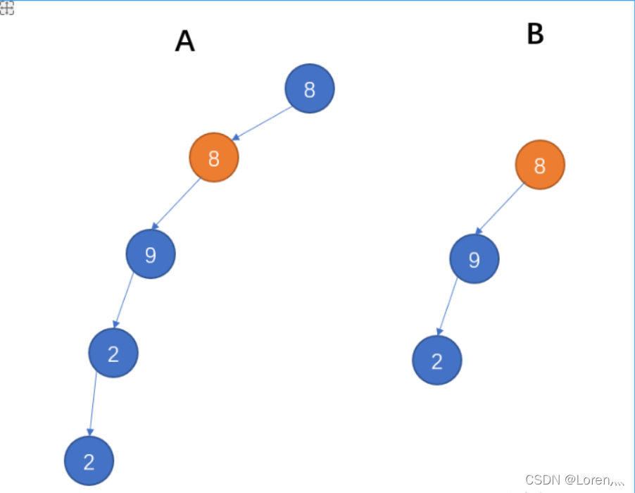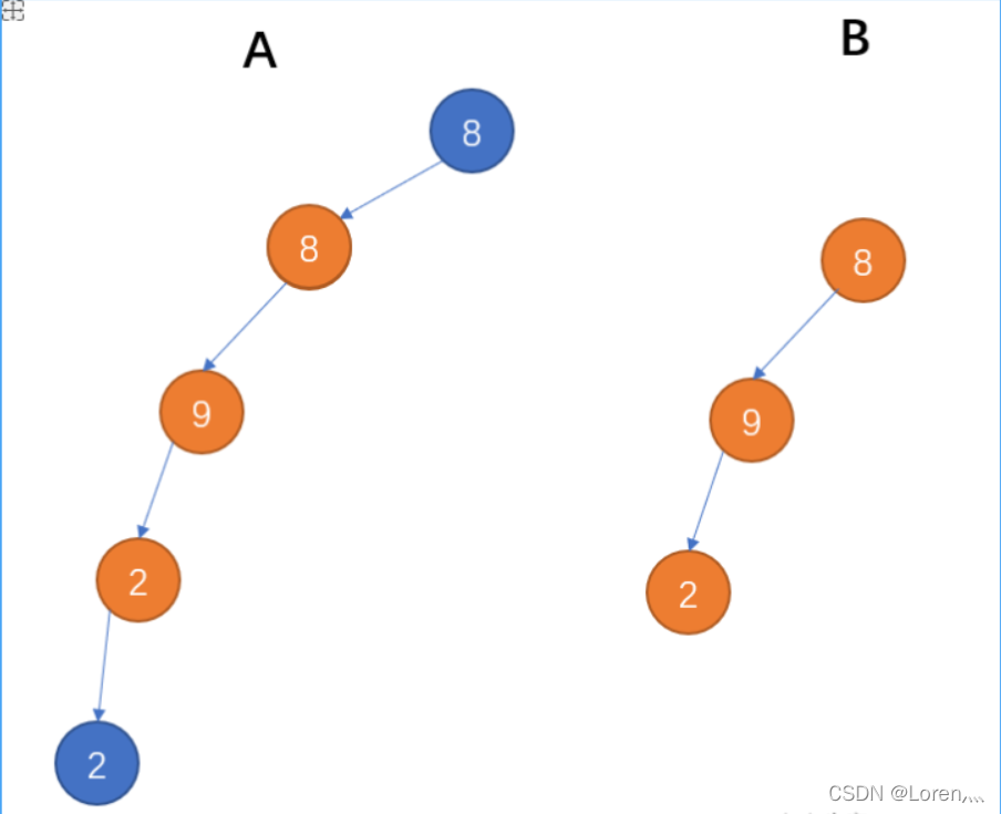 假如给定A为{8,8,7,9,2,#,#,#,#,4,7},B为{8,9,2},2个树的结构如下,可以看出B是A的子结构