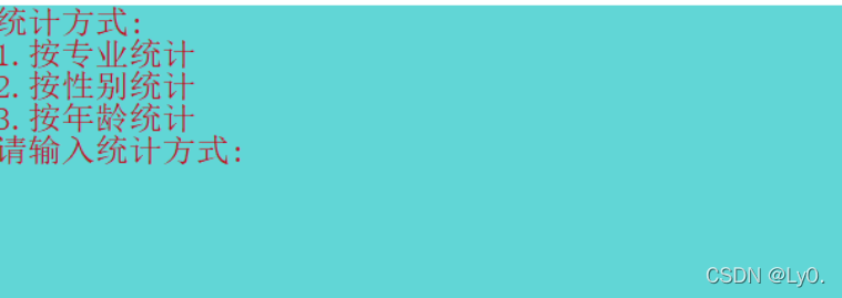 cout<<"统计方式:"<<endl<<"1.按专业统计"<<endl<<"2.按性别统计"<<endl<<"3.按年龄统计"<<endl;