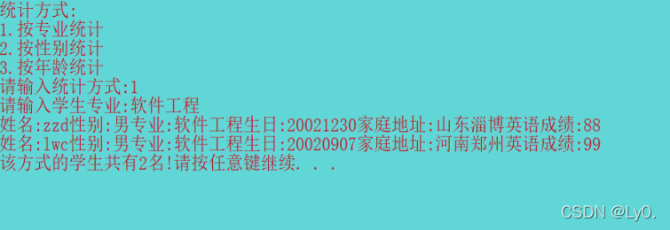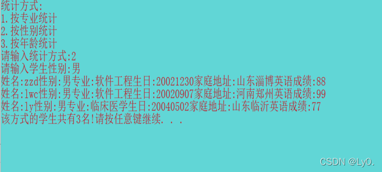 输入2按性别统计,输入性别该性别的学生全部打印,并显示共有多少名学生