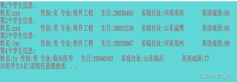 结构体的数据域存放了学生的姓名,性别,专业,出生日期,家庭地址,英语入学成绩,指针域存放的next为指针类型的成员,它指向struct类型的数据?。