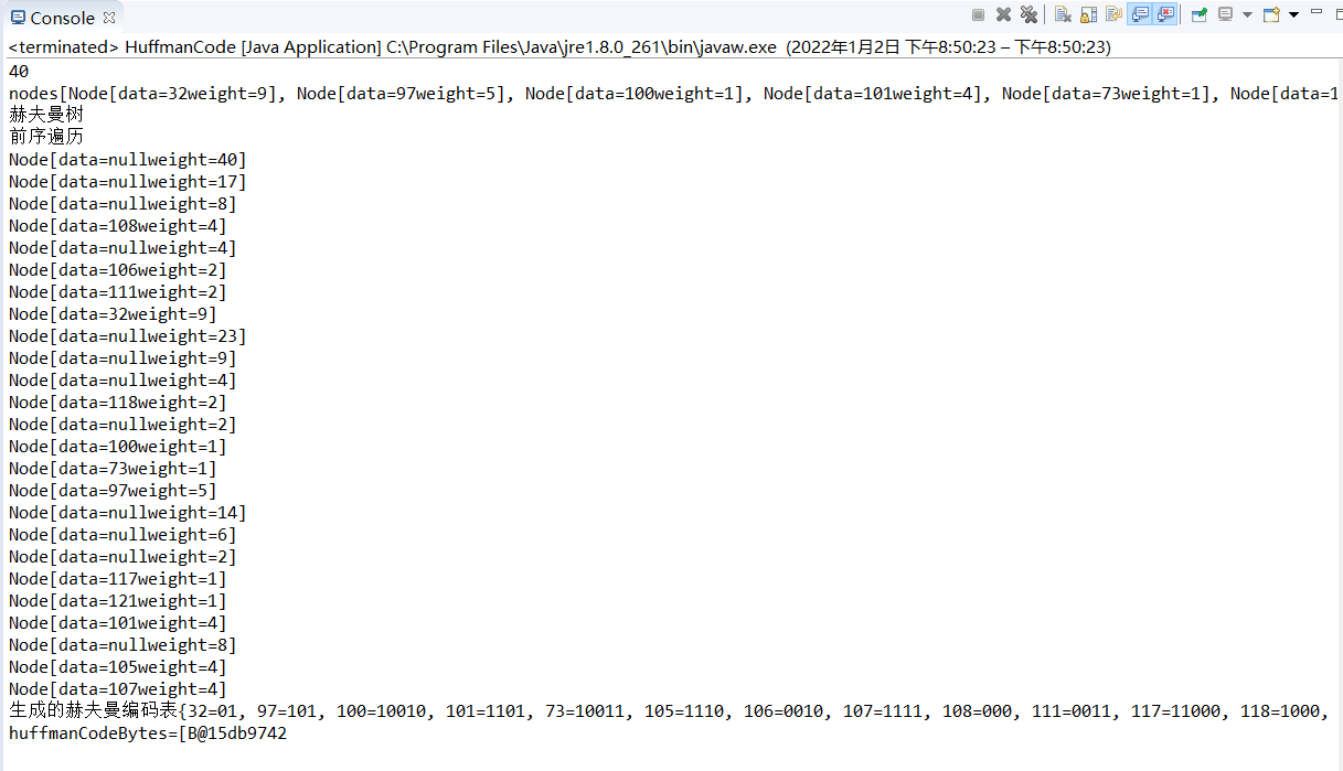 System.out.println("huffmanCodeBytes="+huffmanCodeBytes);