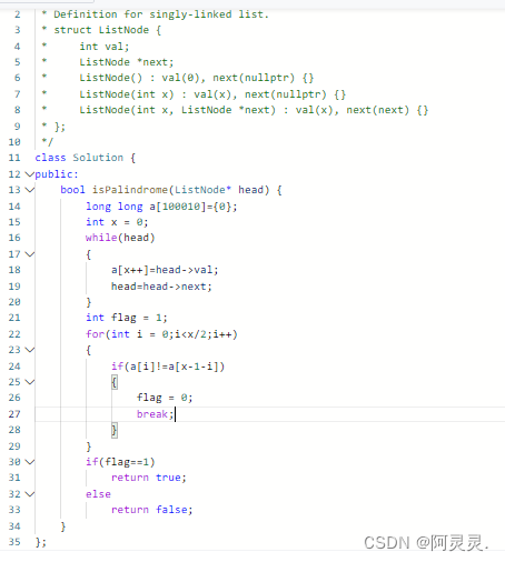 这道题就是有关线性链表的题目,我是用c语言写的,我用一个数组,把链表上面的值都存放在数组里面,最后再去判断是否是回文链表。 -