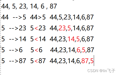 至此本轮比较完毕 我们找到了最小的那一个23 并将它置于最后 数列最终成为44,87,23,14,6,5