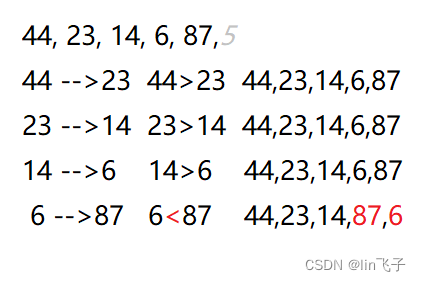 5<14,不满足,5和14置换位置,数列成了44,23,14,5,6,87