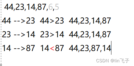 6<87? 不满足大到小 置换位置 所以就变成了87,6 所以数列就成为了 44,23,14,87,6
