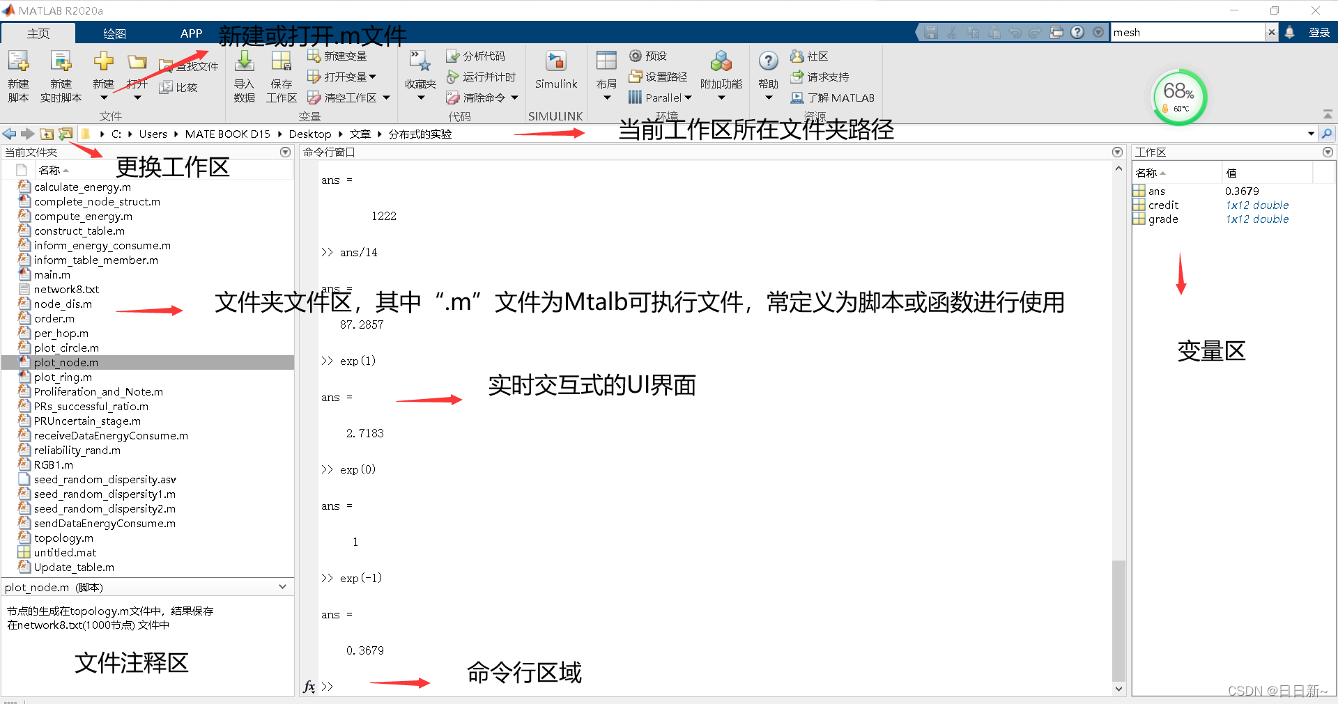 此外,Matlab中使用%进行注释,可执行文件为.m文件,常被定义为脚本 (一堆命令的集合) 或函数(基于输入输出实现某些特定功能)。