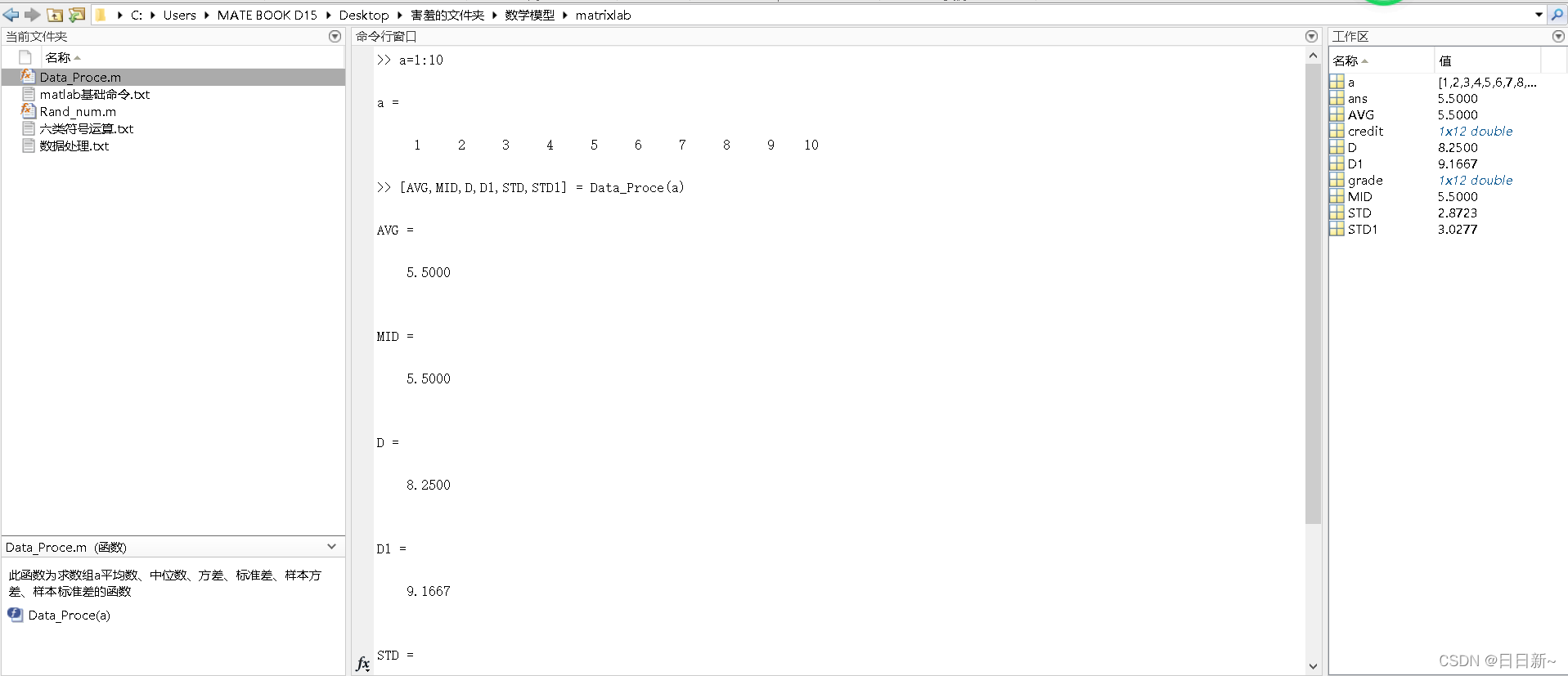 定义数据处理函数 Data_Proce,输入形参a,输出参数?[AVG,MID,D,D1,STD,STD1]