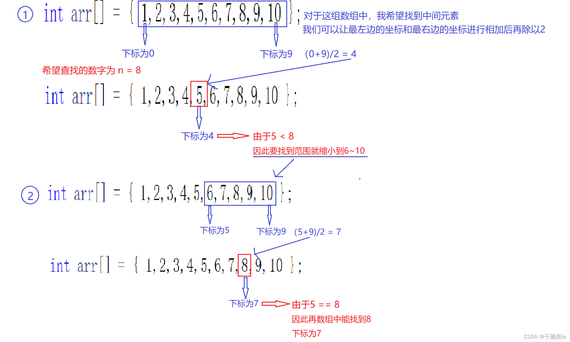 对于一个数组,我们可以找到其对应的左下标和右下标0和9,通过将其左右下标相加除以2来找到其中间元素4,再将其中间元素与要找的数字进行大小比较。