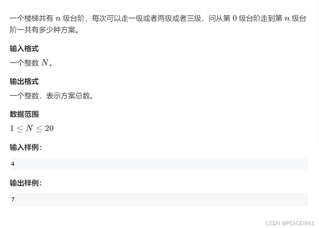 - 算法思路:如先从第m级考虑,设走到m级方案共F(m)种,根据题意,走到第m级台阶的上一级只能是第m-1、m-2级和m-3级。即F(m)=F(m-1)+F(m-2)+F(m-3),而F(1),F(2),F(3)是很容易得出的,从而可以求出F(4)。同理可以依次求出够多级数对应的方案数量。