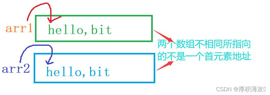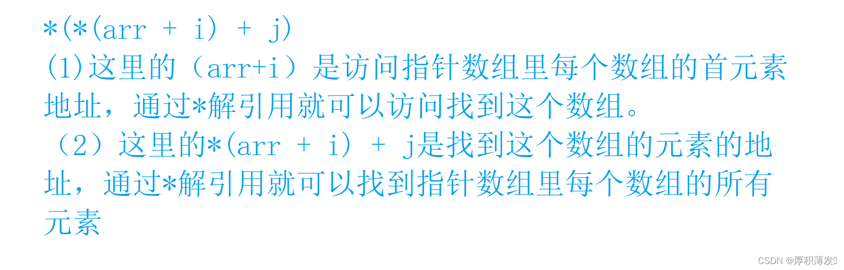 这里的得arr是指针数组,存放指针的数组,数组名是首元素地址,又因为指针就是地址,所以arr指针数组存放着三个数组首元素地址,当访问数组时访问的是这个数组的首元素地址,又因为数组在内存中是连续存放的,我们只要有首元素地址就可以访问一个数组中的所有元素。