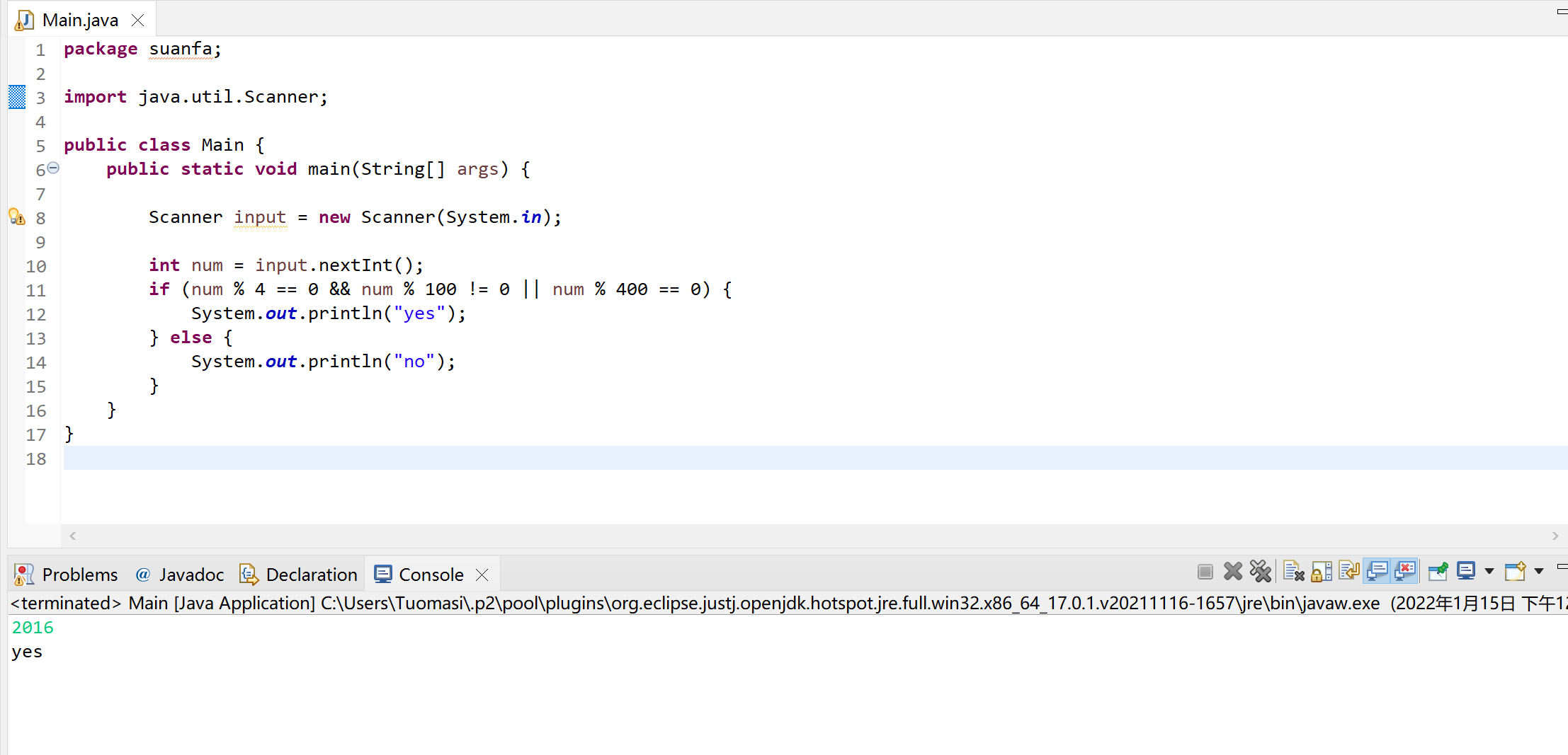 给定一个年份,判断这一年是不是闰年。 当以下情况之一满足时,这一年是闰年: 1. 年份是4的倍数而不是100的倍数; 2. 年份是400的倍数。 其他的年份都不是闰年。 输入包含一个整数y,表示当前的年份。 输出一行,如果给定的年份是闰年,则输出yes,否则输出no。 import java.util.Scanner;