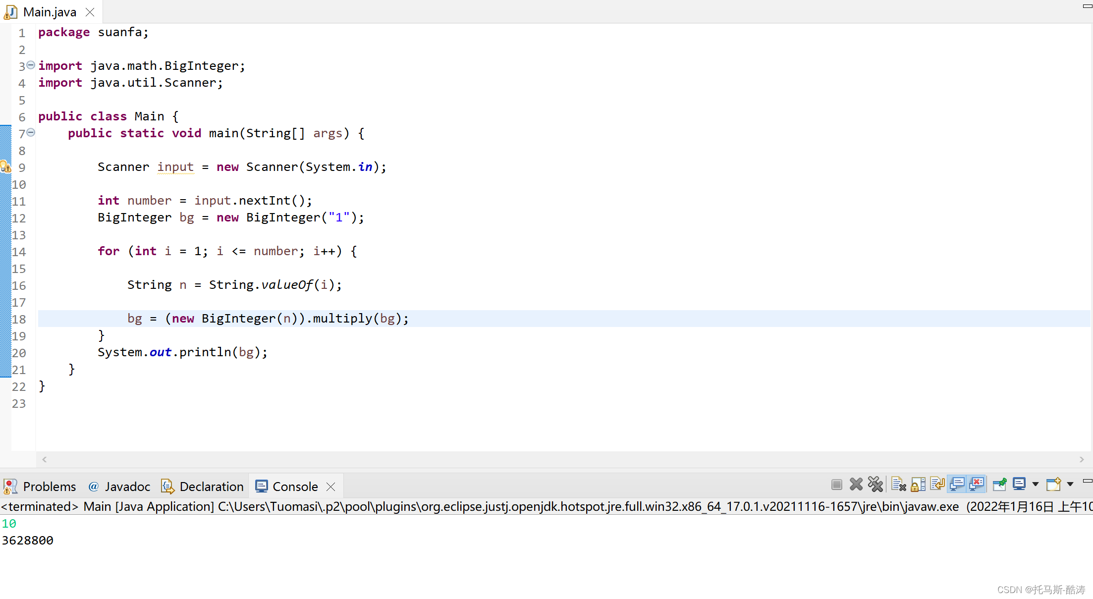输入包含一个正整数n,n<=1000。 输出n!的准确值。 import java.math.BigInteger;
