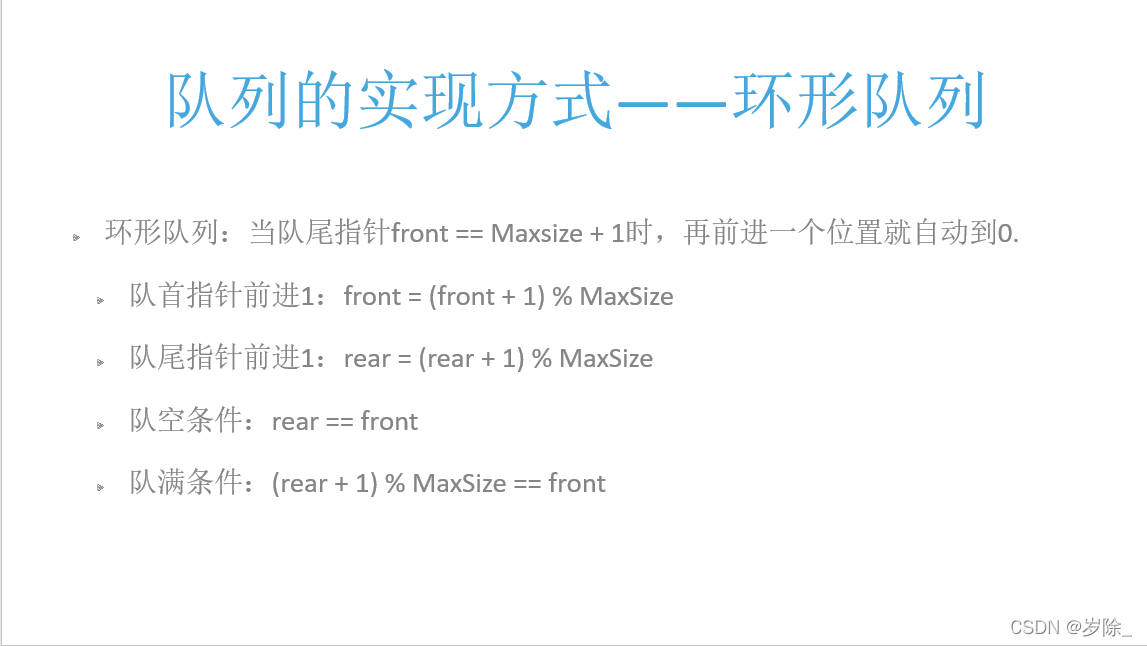 该队列可以转着圈地加或者删除,直到(rear+1)%MaxSize==front队满或者rear==front?队空