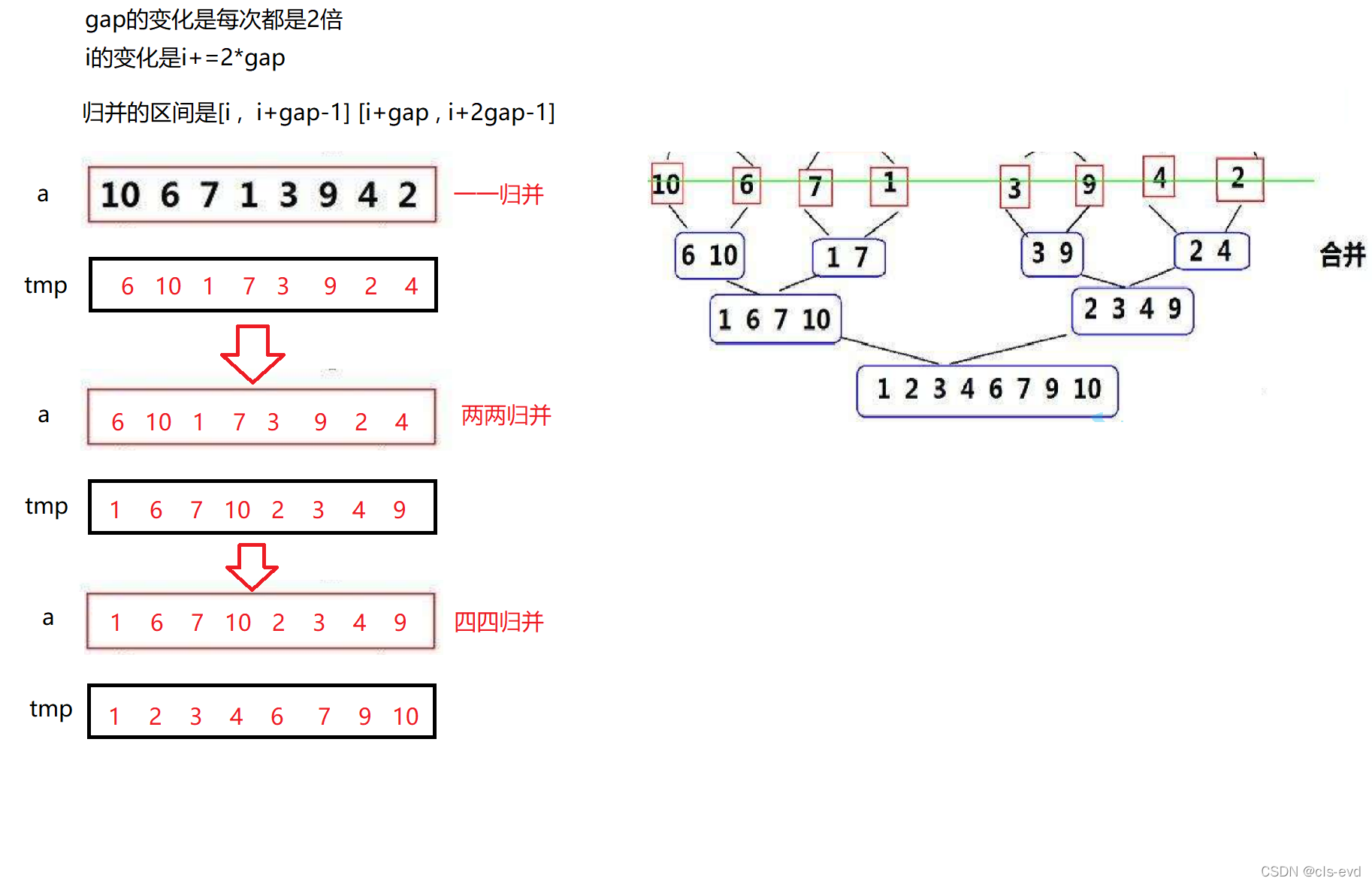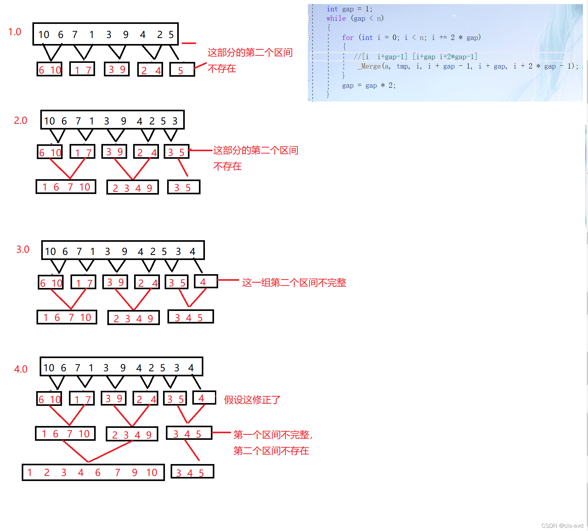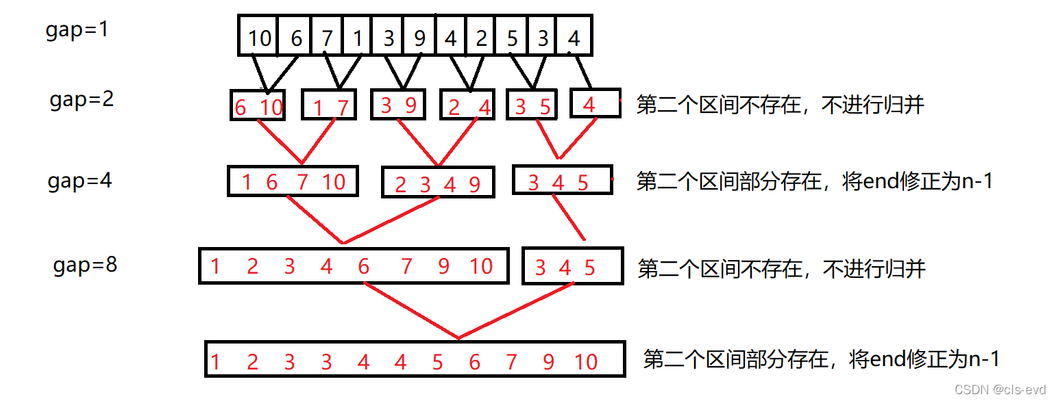 一次循环代表两个区间进行归并,循环要取出间隔为gap的所有区间