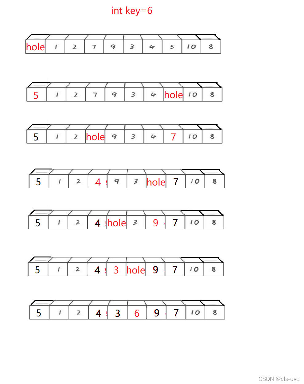 但是这段代码只针对的如上数组,数组只有8个数据,因此我们由特殊推广到一般,对一般的数组会存在以下几种问题