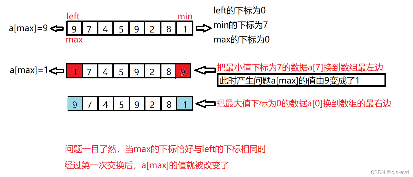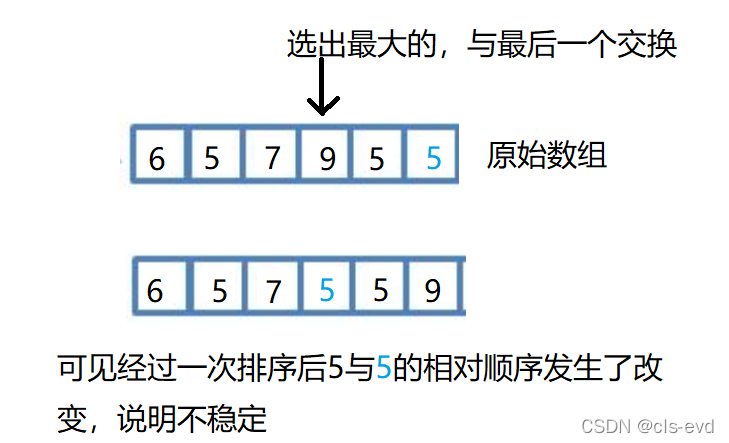 简单选择排序:不稳定,可能有人会说,面对两个相同的最大数字,选择后一个,两个相同小的数字选择前一个就可以做到稳定,但是对以下情况,就是不稳定的。