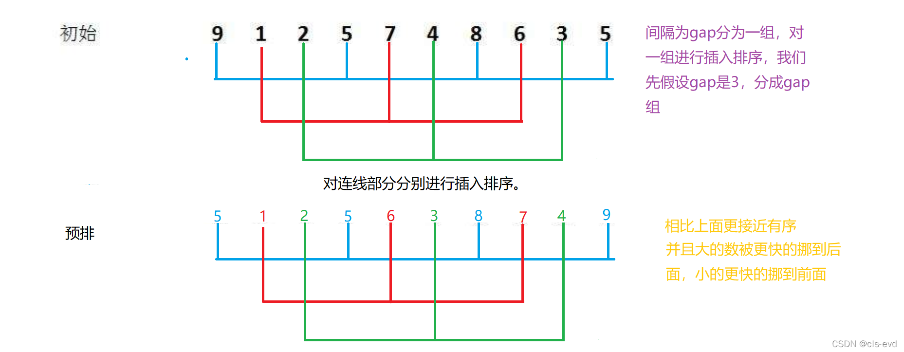 希尔:不稳定,相同的值在预排序的时候分到了不同的组里面