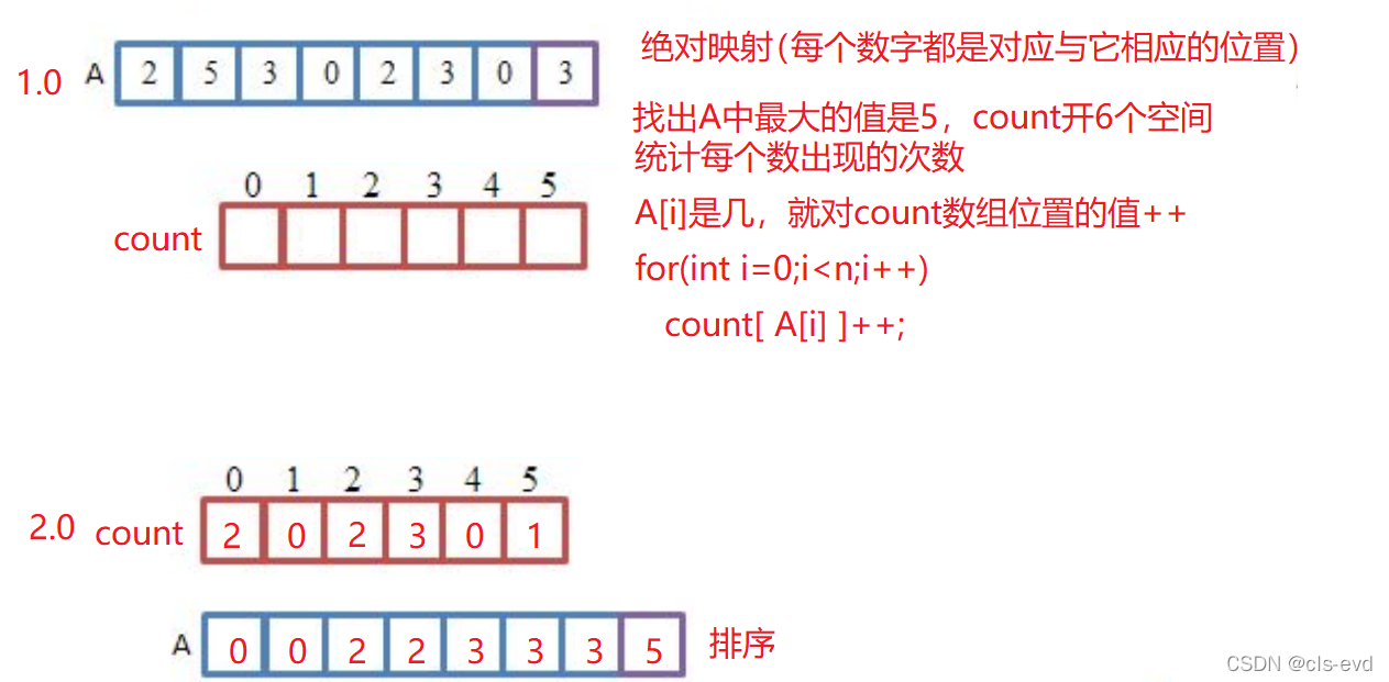 绝对排序:每个数字都放到与它本身的值对应的位置,例如:5对应5,2对应2