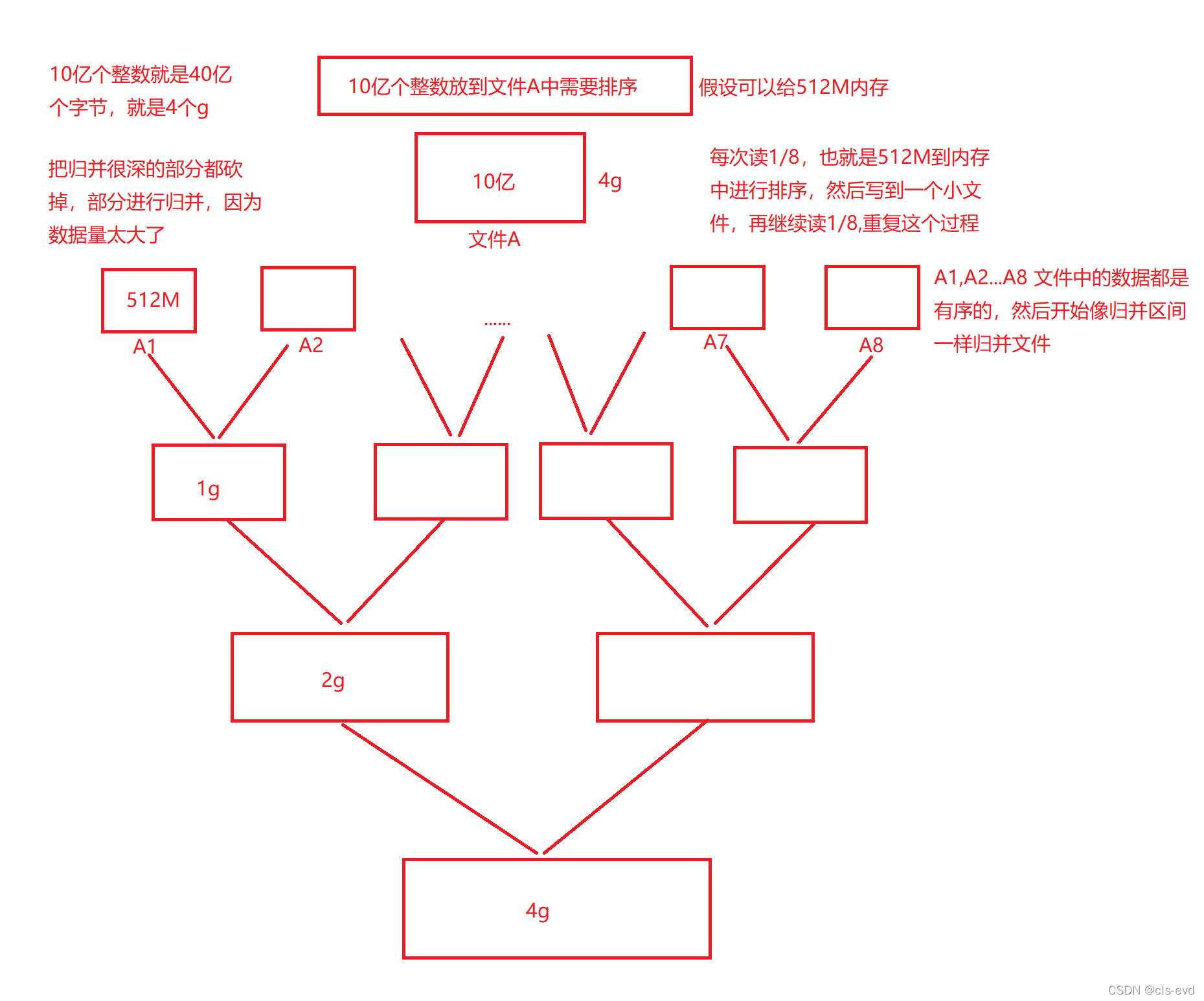 思路:首先想办法算出文件有多大,10亿个整数就是40亿个字节就是4g的内存,给了512M的内存能用,我们就可以考虑将其分成8份,每次读1/8,也就是512M到内存中进行排序,然后写到一个小文件中,再继续读1/8,重复这个过程,接下来就可以进行归并了,因为每个小文件中的数据都是有序的(类比归并有序的区间),这里的归并相当于把归并很深的部分都砍掉,部分进行归并,因为数据量太大了,注意:这里在512M内存中的排序可以用其他排序,但不用归并,因为它有O(N)的空间复杂度