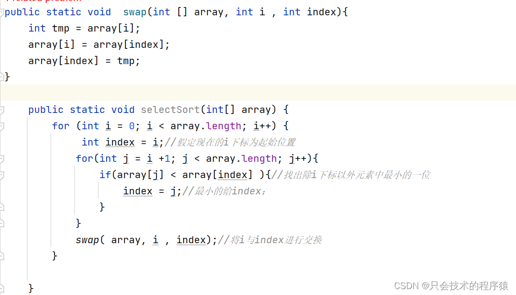 第二部 设置循环 利用 j? 循环找出除 第一个元素以为最小的元素 将其交到index下