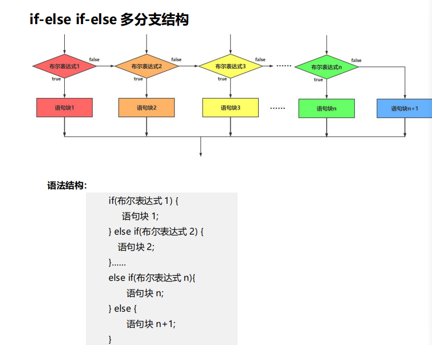 if结构虽然能分为 if 单分支结构、if-else 双分 支结构、if-else if-else 多分支结构,但是判断的本质都是一样的,都是通过if后面括号内的布尔表达式去进行判断是否执行。
