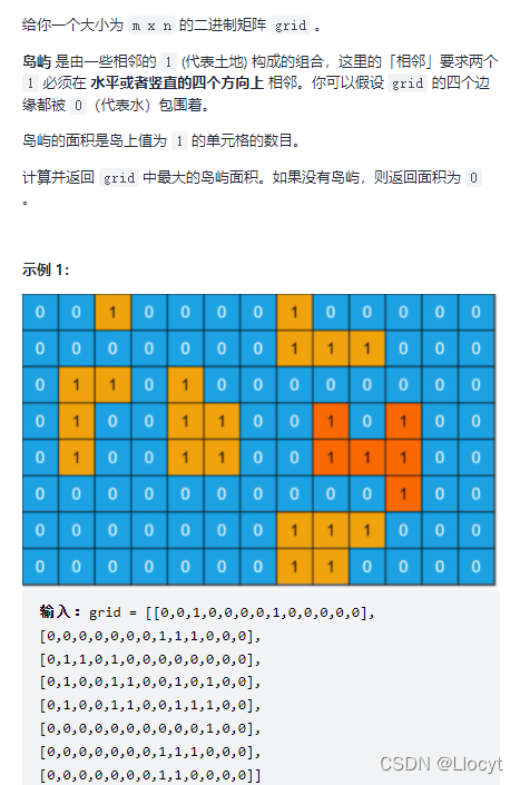 岛屿?是由一些相邻的?1?(代表土地) 构成的组合,这里的「相邻」要求两个?1?必须在?水平或者竖直的四个方向上?相邻。你可以假设?grid?的四个边缘都被?0(代表水)包围着。